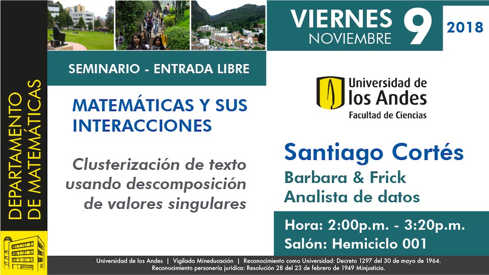 Seminario de Matemáticas y sus Interacciones. Clusterización de texto usando descomposición de valores singulares. Los esperamos este viernes 9 de noviembre de 2 a 3.20 en el hemiciclo 001. ¡No faltes!