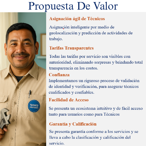 Servicios técnicos domiciliarios, Plataforma digital, Asignación inteligente, Geolocalización, Diagnóstico pago, Automatización conversacional, MVP, Marketplace de técnicos, Experiencia del usuario, Formalización laboral