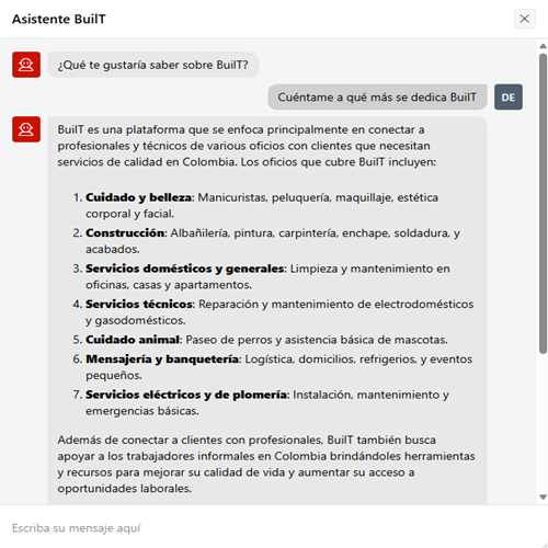 Para reforzar la seguridad, BuilT incorpora validaciones de identidad para socios y usuarios, además de una garantía opcional para los servicios contratados. Esto reduce los riesgos y eleva la confianza en cada interacción.
