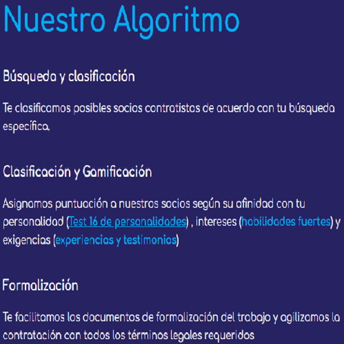- Se diseñó y desarrolló un sistema inicial de coincidencia entre usuarios y socios, basado en variables como experiencia, ubicación, disponibilidad, reputación y estilo de trabajo. Este motor de matching permitió mejorar la precisión en las sugerencias de perfiles y preparar la lógica para la versión más avanzada del algoritmo.